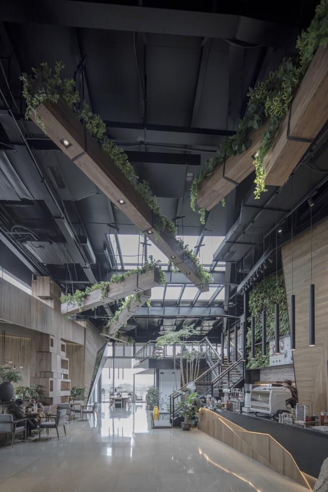 川西传统民居多设有挑檐与檐廊,其在空间体验上与功能使用上均有着非常积极的意义。挑檐与檐廊一方面形成了室内外之间过渡的灰空间,丰富了空间体验;一方面在炎热且多雨的川西地区起到遮阳躲雨的作用,同时对墙体也起到一定的保护作用。本案采用钢结构体系,以现代的建造技术营造出架空层、大面积檐下灰空间及外延挑台,附以底层地景式的建筑形式使得檐下空间尺度更为多变灵动,丰富与立体。来往人群在其自由穿梭与停留,在“室外空间”——“半室外空间”——“半室内空间”——“室内空间”中转换,配以自然绿化对空间的嵌入构造出宜人的空间场所。