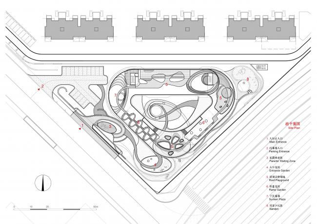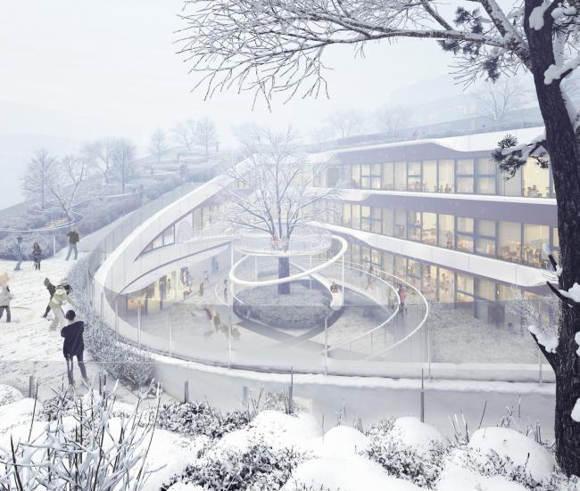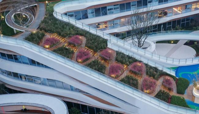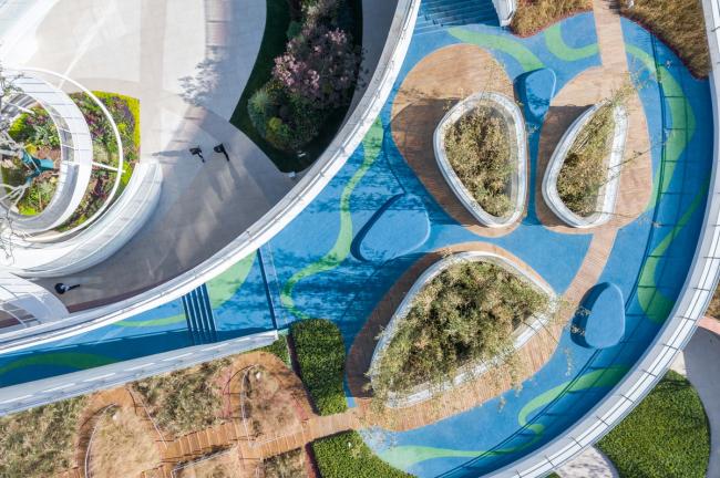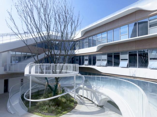 为了增加趣味性,建筑设计和景观要素在三维上皆做了充分的融合,使整个幼儿园成为了能让孩子们流连忘返的乐园。首层入口处利用反梁创造了一个开敞的16米跨度的低矮空间。两层通高的音体多功能室的上空通过降板使屋顶下沉花园成为可能。而在建筑体量围合出的中庭所设置的飞廊和滑梯,不仅是整个室外活动的高潮,更从流线上将屋顶活动空间与首层景观无缝对接,促成循环更为无痕、层次更为丰富的空间体验。孩子们可以从首层的中庭攀爬飞廊来到二层,通过二层的开洞和下面的伙伴打招呼,再坐滑梯回到首层;亦或是穿过斜坡花园来到顶楼,再坐滑梯回到二层…