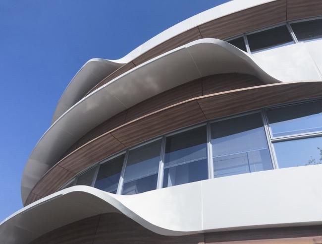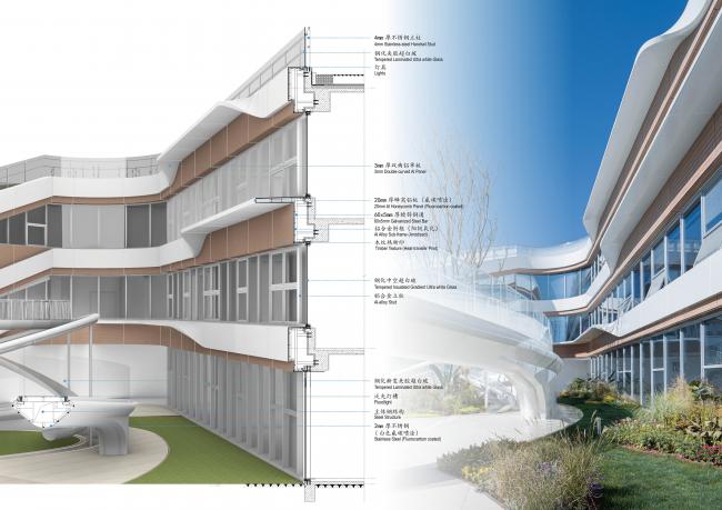 通过白色铝板在表面的流动和扭转,建筑立面在观感上显得流畅且富有韵律。木纹转印的铝板作为衬托,为建筑进一步增添了温暖和细腻的氛围。双曲铝板在深化过程中做了充分的优化,以此实现了模块化的加工和建筑表现力之间的平衡。而扶手采用的雾化玻璃为连续的屋面勾勒出兼顾安全与诗意的边界。