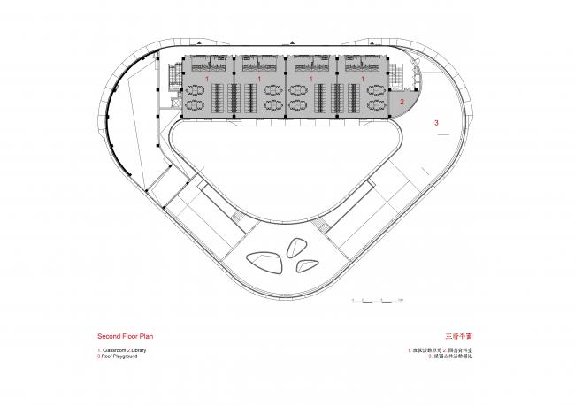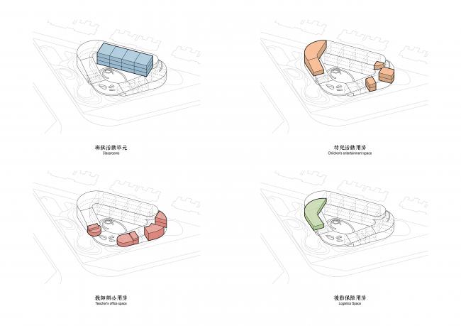 为了保证孩子们活动中所需的日照时间,北侧朝南的3层体量被设置为12个班级的主要教学空间,两侧逐渐跌落,分别附以其他功能用房。整体形体在不同的方位再由不同高度的坡道整合,串通二层以及三层的屋顶,创造了一个连续的屋顶活动平台。这样,每一层的小朋友都可以在所在层享受到室外活动场地的同时,不知不觉玩到下一层或者上一层,与更多的朋友交流互动。建筑内部布局采用了单边廊道,将室内自然采光及通风的效率最大化。