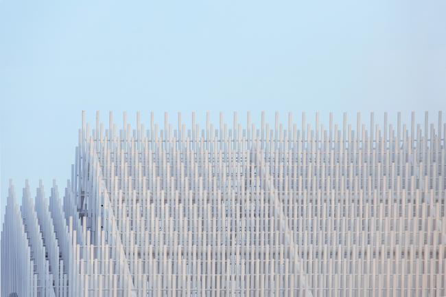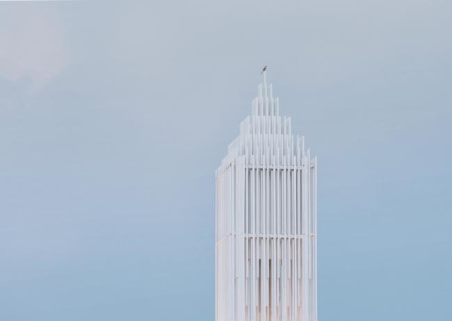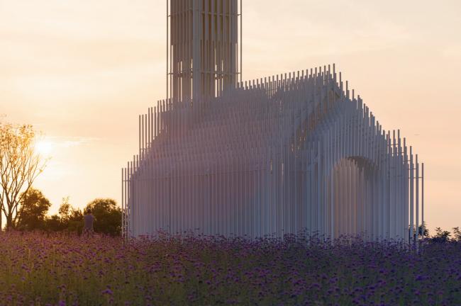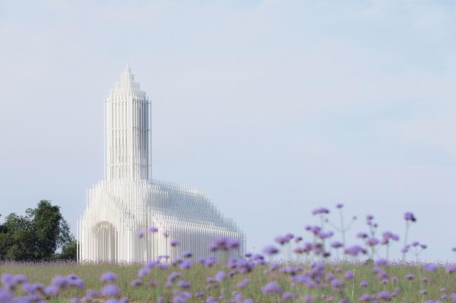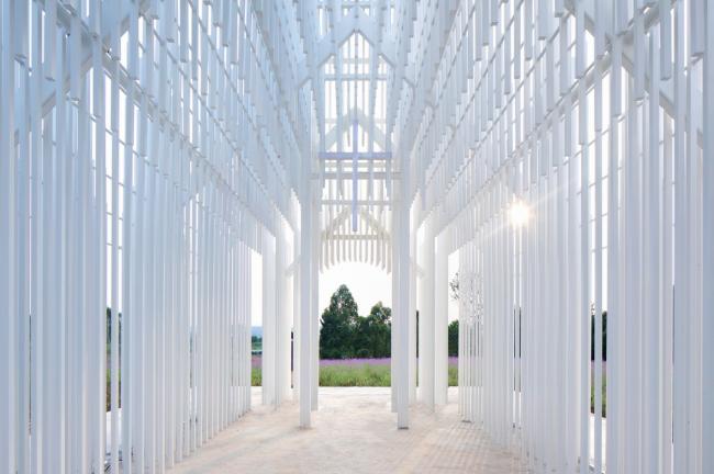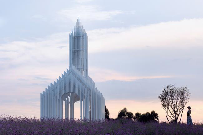 教堂的形象取自于传统西方教堂的样式,当阳光照射下来,被一束束光线贯穿而过,又幻化成了一道道光束,这一道道白色的“光束”又组成了一座可以被光穿透的教堂。光永远是教堂不可缺少的元素,这种最自然最纯净的材质成为了我们这座教堂的灵魂所在。