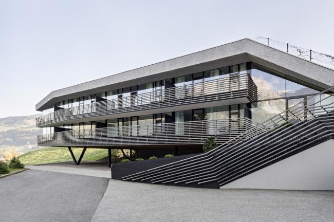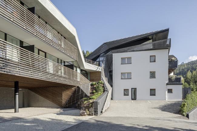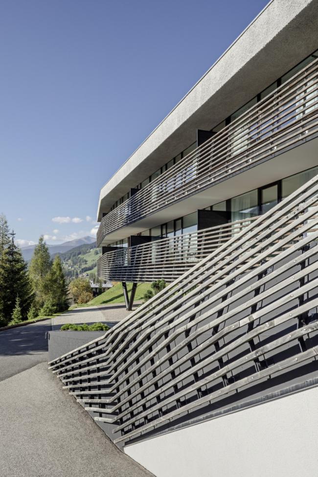 斯特拉塔酒店于2007年竣工。一个微妙的、平行的落叶松木条屏障揭开了建筑的体量。松木屏障遍布整个建筑,像是从场地周围生长出来。2014年,在Alma旁边、一个建于20世纪60年代的宾馆拆除了很少使用的倾斜屋顶,并添加了以前不存在的垂直流线和寄宿家庭的房屋。