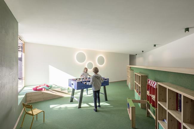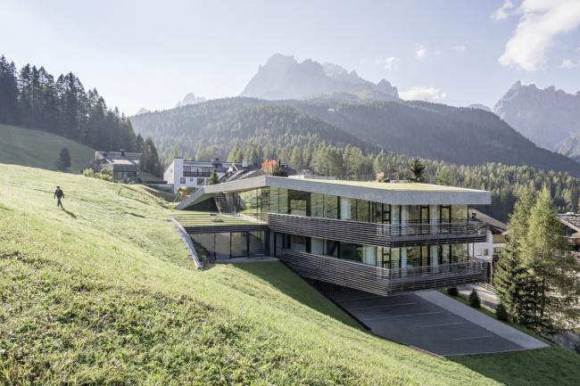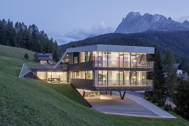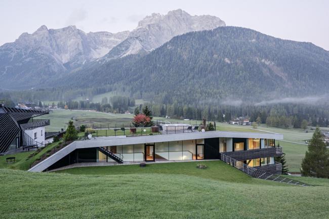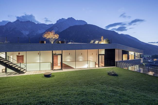Strata 和 Paramount Alma 的策略不断跟进:从陡峭的地形开始,落叶松木条屏障缓缓揭开了建筑的体量,形成覆盖的外部空间,其中部分屏障被引入到内部,然后变成通道和停车场的天花板,创造出一个主题连贯且有氛围的空间。在这个空间可以看到周围的山景。粗糙的喷塑灰泥、大的落地窗和有微微棱角的木条则决定了外观形式。