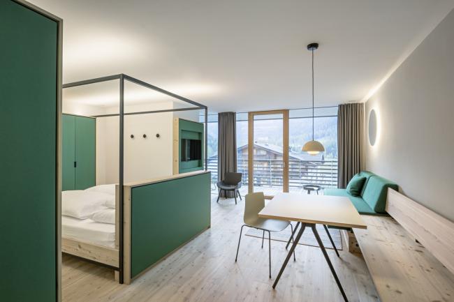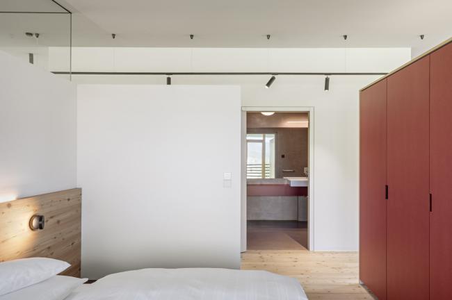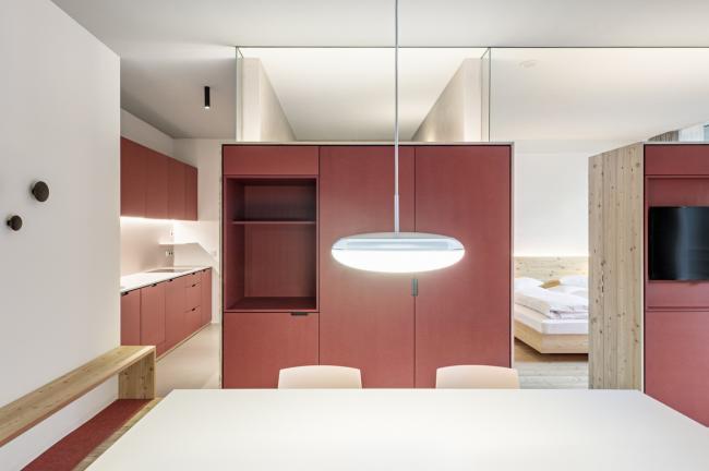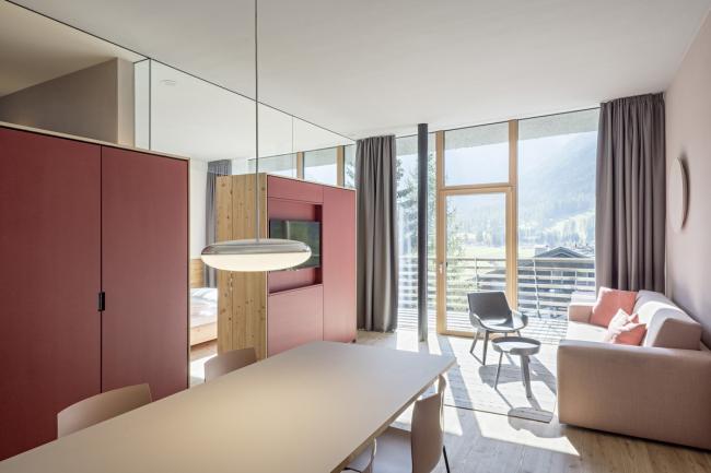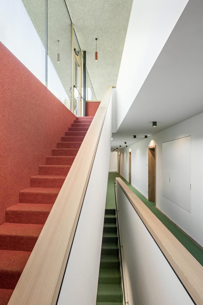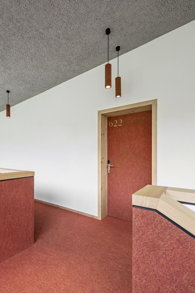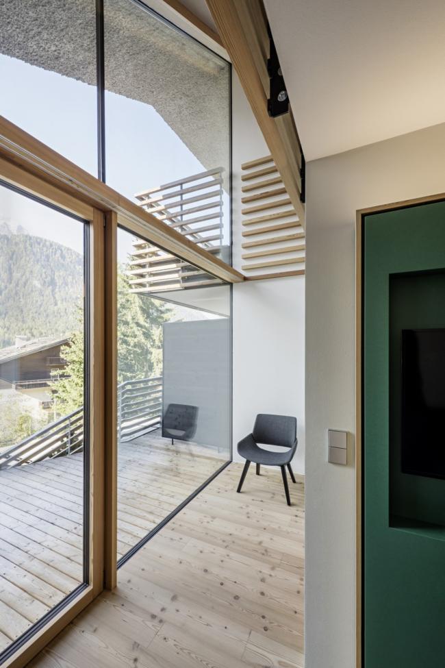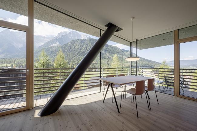 内部的特点是与外部有很强的关系:光线和视野都被带进深处的室内空间。本地落叶松木材是主流材料,也是外观以及内饰的主要材料。 在室内,它与不同的颜色相结合,颜色变化因地板而异。除了小木屋外,宽敞的空间感和美丽的景色是山中度假的要素。