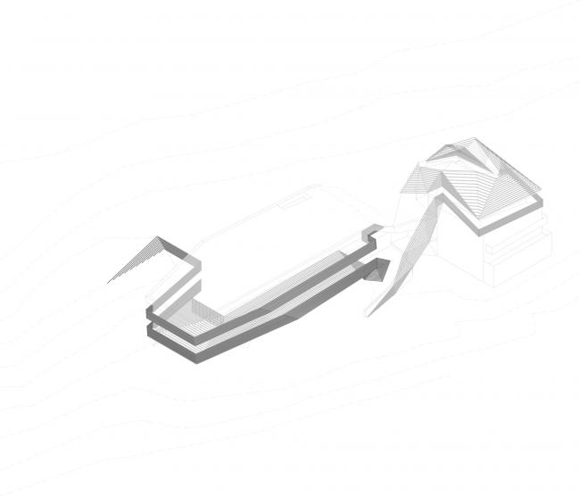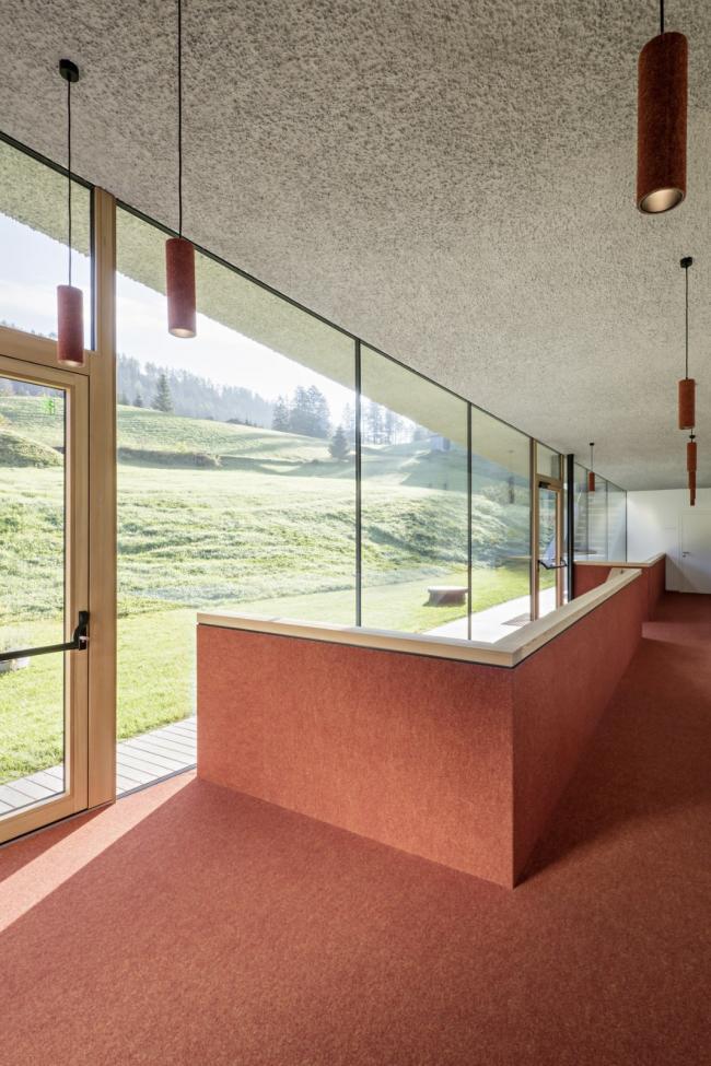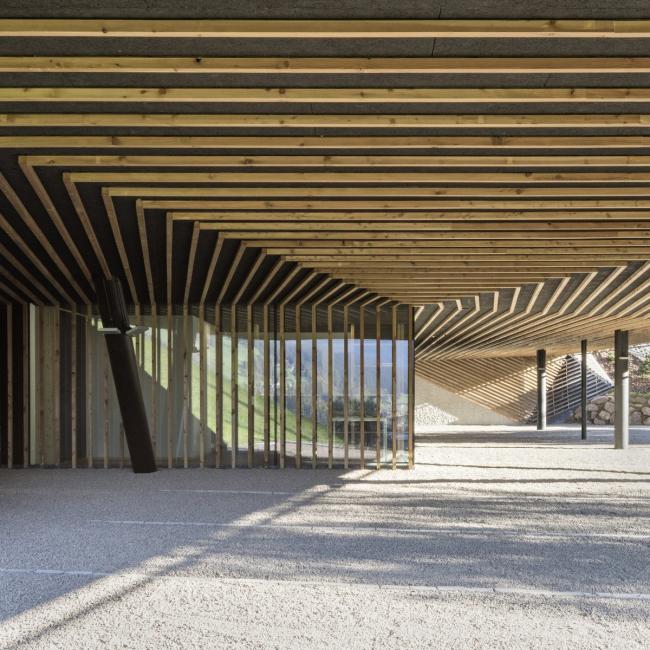 由于紧邻斯特拉塔酒店,木屏障的主题被重新调整:这次,两条木屏障沿着复杂的几何体积流动,覆盖了白色现有建筑的后面和上方,并与周围的地形连接。室内设计得益于外部空间的在建筑体量和木屏障变化之间产生的开口。自然光通过开口渗透进室内,提供给室内一种全景的视野同时,将天空引入到建筑内部深处。这些都是得益于木屏障在外部的变化。