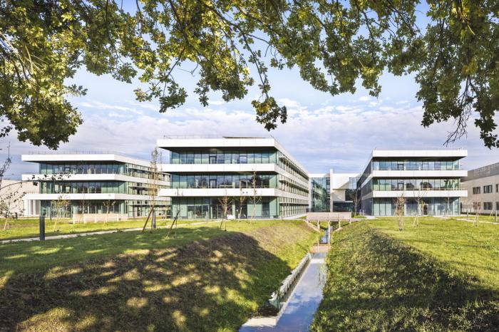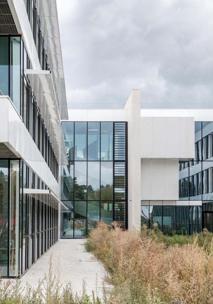 建筑师设想了一个由巨大的圆形图案组成的建筑和景观实体。该项目是液化空气研究与创新集团的主建筑物,代表了全球重建的第一阶段。这座大的圆形建筑通向一个种植中心,远离街道,以尊重周围环境的居住特征。