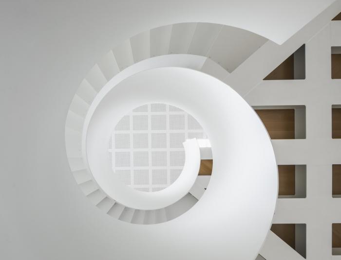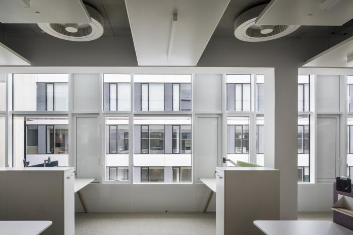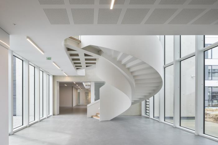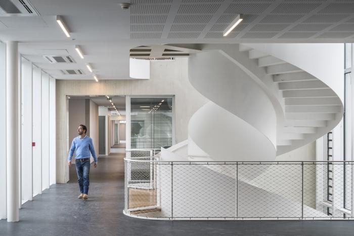 建筑的走廊汇聚于这条“研究轴线”,使用者可以在此聚会。夏天,这一组合的深度和南北走向可提供自然的夜间通风。粗糙的混凝土楼板所积累的热量被存储起来,然后在白天释放出来;辐射板则可以在冬天供暖。