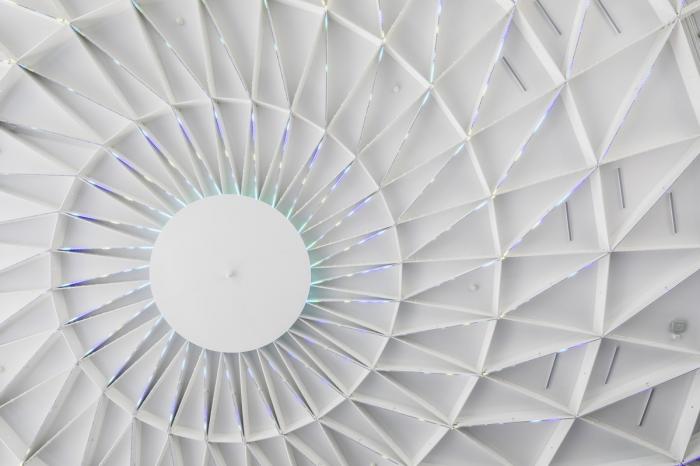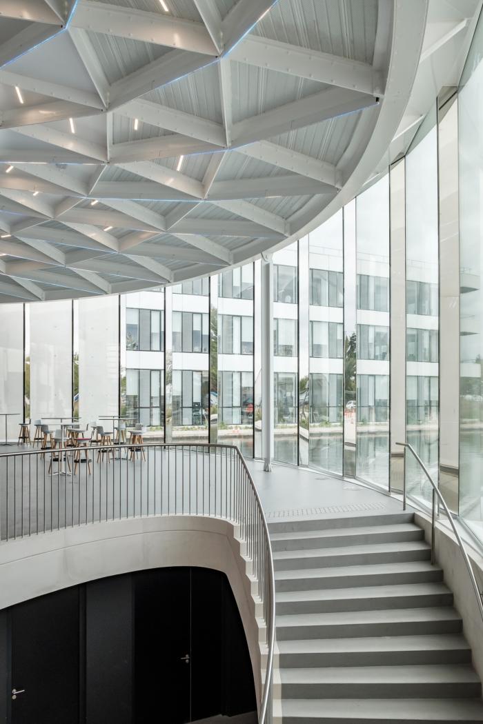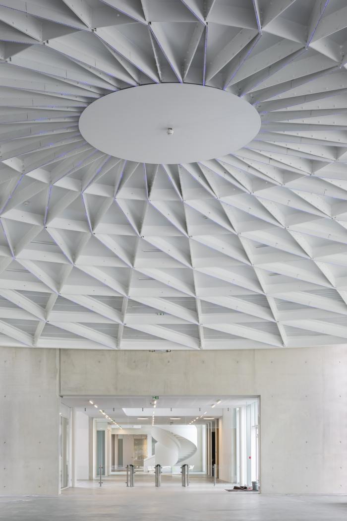接待亭将游客引向“圆形大厅”。圆形大厅是外部环境和研究中心之间的过渡空间,由一个巨大的钢“网壳”穹顶遮挡。空间向西延伸到一个倒影池,然后向工业区的其他部分延伸。从圆形大厅可以进入礼堂。