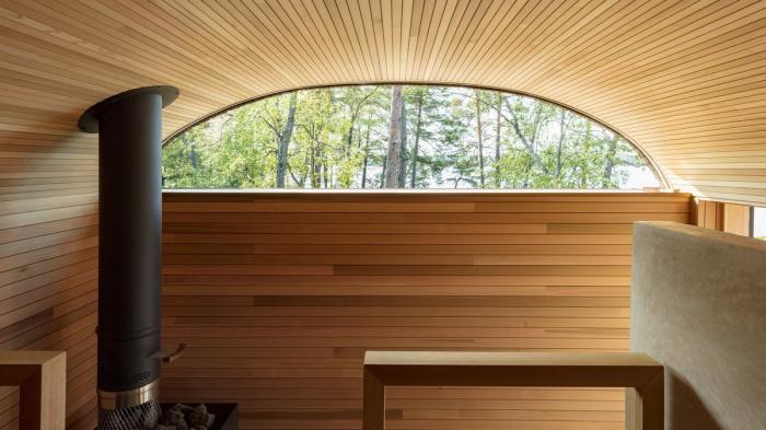 项目场地的周边拥有许多既有的木制建筑,因年代久远,许多房子的立面都开始呈现出富有年代感的灰色。而建筑师在这栋新建筑的外观处理上,并不希望设计一个相同色调的灰色小屋。相反,建筑师希望新置入的房子可以跟海岸上的云杉和松树融为一体,从而形成其特有的视觉语言。同时,建筑师还根据日落和大海的朝向,依据场地地形,决定了这间桑拿旅馆的最终朝向。若用户置身于由柏木搭建而成的桑拿房中,其视野可以通过一扇弧形的窗户,一直眺望到岸边的船道和日落时分的美景。