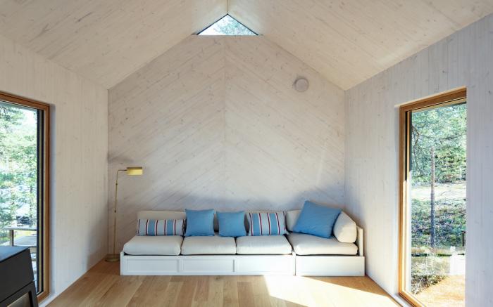 而得益于建筑师在桑拿房和客房之间的空间分隔,置身于客房之中的旅客,同样可以欣赏到壮美的日落场景。建筑师选择了最新的交叉层压木材用于建筑的整体建造。而在外墙的设计上,建筑师则用云杉木对其进行了覆盖,并用当地传统的黑色Falu涂料对其进行了涂装。而镀锌的屋顶,也将在随后的几年内被漆成相同的深色调,以求整体的和谐与统一。