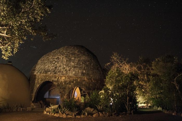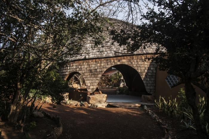 每一个集群都可以俯瞰一个像豹爪印一样,用来吸引野生动物的水洞。水疗中心从海滨开始。从远处看,这些大型建筑似乎非常坚固的,但走近仔细观察你会发现它们是一种编织的网格状竹结构,用回收的柚木做成。巨大的拱形开口和高高的拱形天花板营造出一种强烈的空间感。现存的植被被保留下来,以确保景观的真实体验,还有由 Adrian Gray 提供的具有吸引力的节水型尖刺植物和优雅的岩石平衡雕塑。