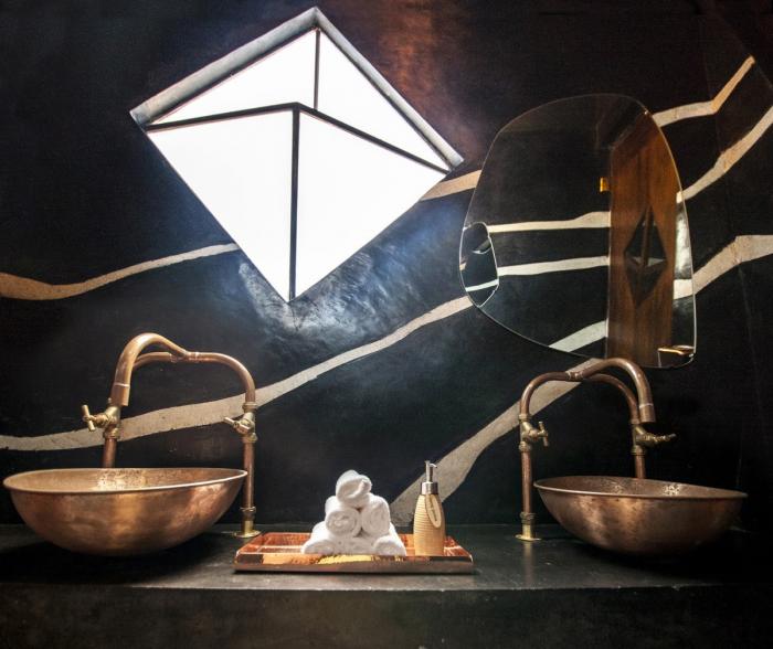 建筑的重点是巨石的外部,而内部的特点则是仿佛隐藏在洞穴、水晶和珍贵矿物的脉络之下的宝藏。在这里可以捕捉到一种发现、冒险和迷人的感觉,把生态的奢侈和当地的优势结合在一起。设计的重点放在高质量的材料上,石、石英和泥砖等当地材料与丰富的铜、黄铜、水磨石、木材、竹子和纺织品搭配在一起,与现场环境相呼应。设计的亮点包括在餐厅和酒吧里流动的游泳池,像夜空一样明亮的灯光,在餐厅10米高的竹穹顶上悬挂着一盏亮闪闪的铜叶树,泥砖的座位装置和强调主空间的竹枝吊灯等。