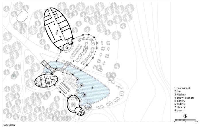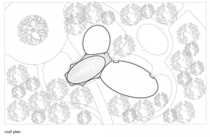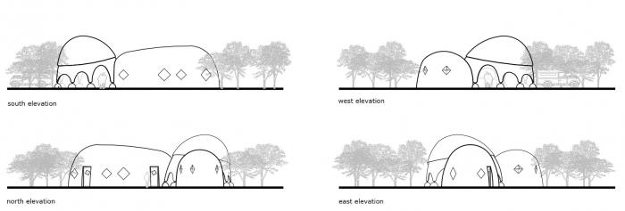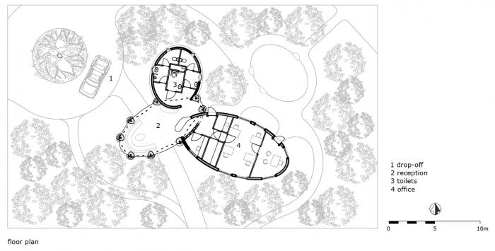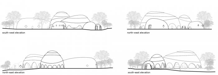 该项目由 Dilmah Tea 公司旗下的Resplendent Ceylon公司委托进行,该公司独特的度假村为好奇的旅行者提供了与斯里兰卡的历史、文化和自然有关的各种体验。建筑在雅拉的景观中自然形成,宏观上仿佛在公园内散布的圆形巨石,在微观上又好像白蚁丘。为了适应人体尺度,营地的主建筑看起来就像是在场地两端有机地聚集在一起的卵石状亭子。大的开放体量与小的封闭圆屋顶相交,提供更私密的功能。餐厅和图书馆入口处的欢迎区是一个蜿蜒曲折的自然景观,线性排列着一丛丛茧状的张力膜结构。