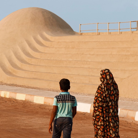 在伊朗霍尔木兹岛上,两个红色水泥覆盖的圆顶通过一系列的台阶相连,形成了俯瞰波斯湾的“罗格文化中心”(Rong Cultural Centre)。