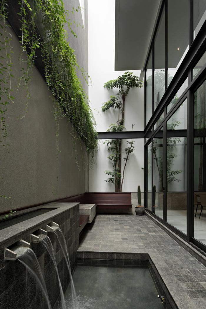 基于狭窄的场地尺寸,地块边界上的墙体作为房子的保护膜被利用起来,构建起了种有植物的小型“口袋花园”,环绕着房屋,充满了阳光和热带植物。这些“口袋花园”和上面提到的室内空隙起着半植被采光井的作用,在把柔和的热带氛围带入这个城市中的家庭空间的同时,将室内外空间融为一体。
