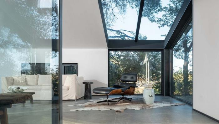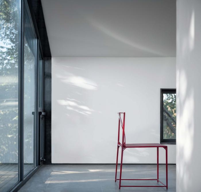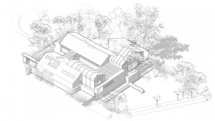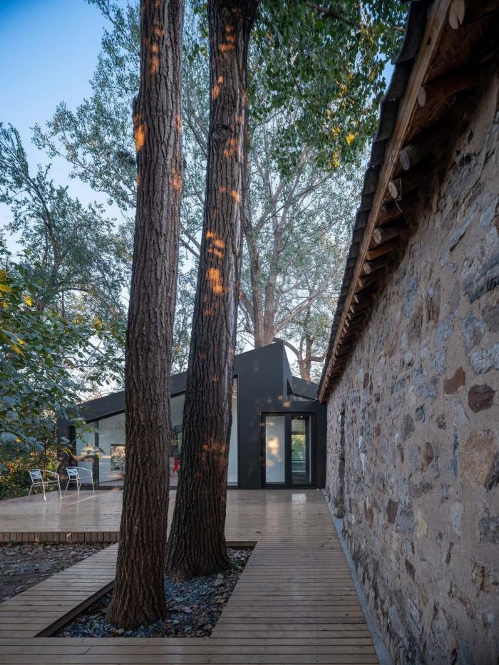 场地东西方向的高差丰富了院落空间的形态。我们根据地形,设计了上下两个部分。在平台分界处,新旧建筑用连廊相接,从室外延伸到建筑内部,模糊了庭院与室内的边界。内庭院将原有的树木保留下来,环绕它们布置了客厅与茶室。透过大面积的开窗,庭中枝桠跃入眼帘,营造出树下生活的惬意场景。