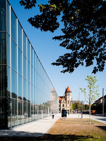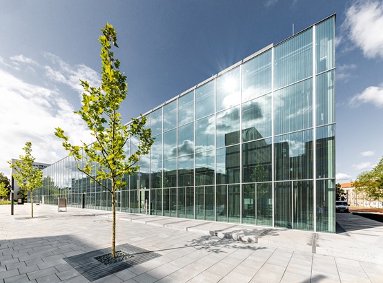 该建筑外观统一,建筑的四面都覆盖着三层玻璃板,三层玻璃板排列在2.1米的网格上。屋顶上有一个绿色屋顶。