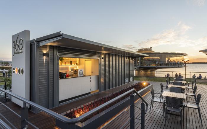 考虑到内部和外部区域,建筑最多能同时服务500人。除了展示一个40英尺的海军集装箱外,它还展示了一个342平米的广场,其中天然的木制甲板,是为餐厅促销活动时大客流量与为人少时静思而专门设计的平台。房间的内部面积为300平方米,用于午餐和晚餐的服务。