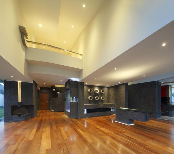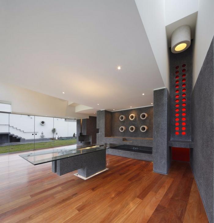这座“黑色的雕刻岩石”将包括位于地下层的拥有四个车位的车库、服务庭院、保姆房和游泳浴池;位于一层的厨房、餐厅和生活空间等。空间的雕琢将会生成有趣的带有强烈纹理的“内置”家具,以与其他的自然和人工材料相协调,使这块带有寓意的岩石保持尽可能自然的状态,最终成为业主心目中的花园的一部分。