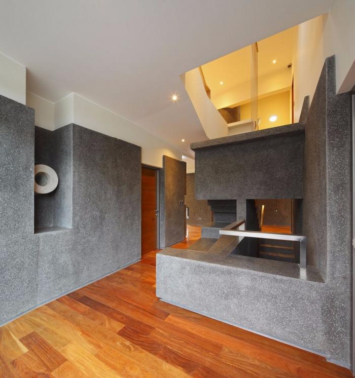 为了完成这项作品,黑色的石头基座支撑着四个拥有私密空间的悬挑体量,因为业主追求“漂浮的白色石头”住宅。