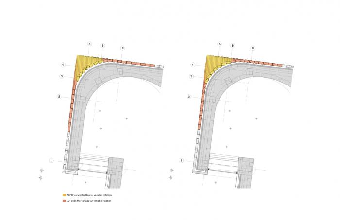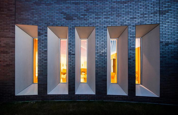 这些特殊的砖石处理方式,包括了顺时针旋转石块,以将传统的粘连叠垒转变为螺旋相连的处理手法;以及在转角处重新将螺旋相连的手法调整为叠垒粘连。正是基于这样的一种顺时针的旋转手法,教堂的角落空间都呈现出一种特殊的“编织感”。同时,建筑师选择了带有铁黑色斑点的砖石,以在将新建的教堂和现有的医院外表色彩区分开来的同时,利用这种材质表面的特殊反光肌理,借助建筑表面的起伏感,来展现富有活力的光感。