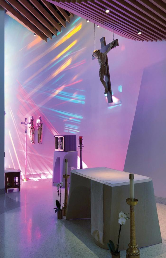 同时,在教堂的朝向设计上,建筑师还充分考虑了其与太阳间的空间关系,以营造一个神圣的光空间。具体来说,建筑师在教堂的东立面设计了一扇偏高的直向窗户,旨在邀请每日清晨6时的阳光进入该空间;而南侧的窗户则装上了特殊的二向色性玻璃装置,以将特定的光谱色过滤到空间中;西侧的并排窗户则与日后建成的疗愈花园间保留了潜在的视觉沟通关系。
