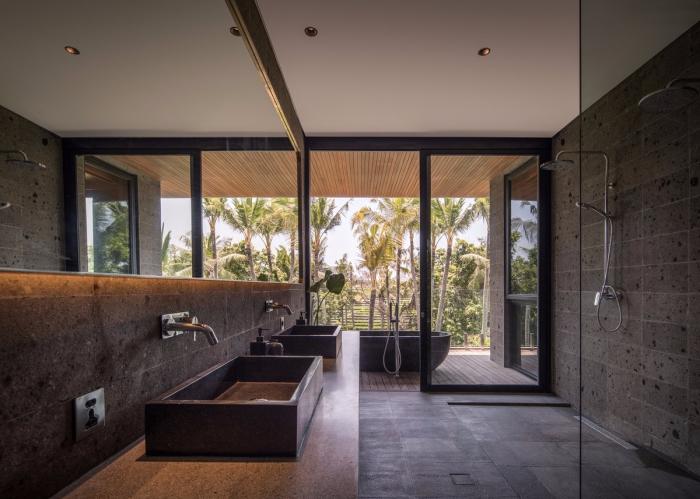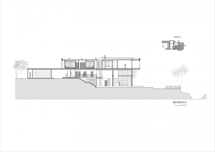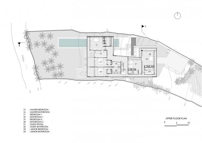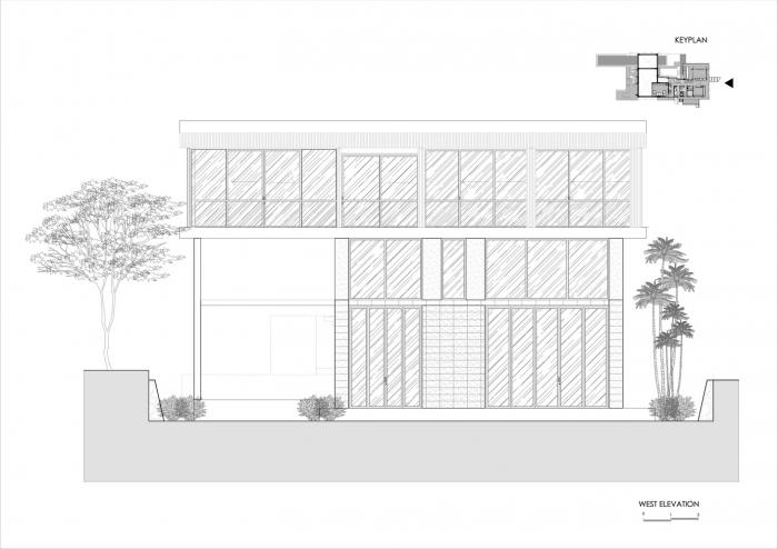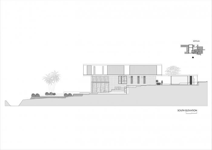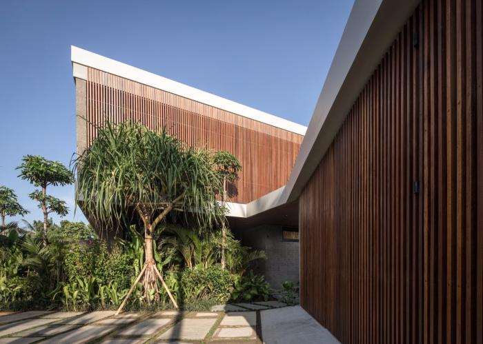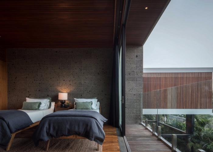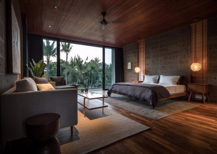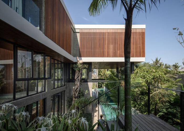 棕榈树林、香蕉树和菩提树环绕着建筑,使其融入连绵起伏的丘陵构成的轮廓和茂盛的稻田之中。建筑的侧立面和正立面采用了木隔栅,这将规划布置的尺度转变为更加抽象的客体,而不是带有窗户的传统的住宅。卧室经过精心布置,天然的石材表面使得每一处空间都成为休息和娱乐的场所。