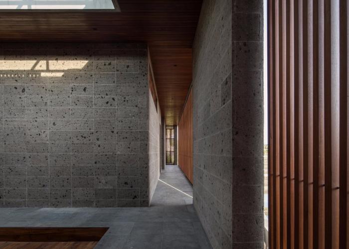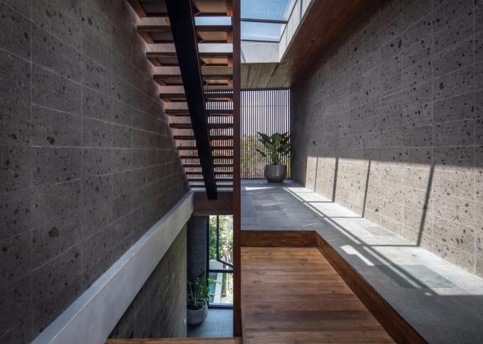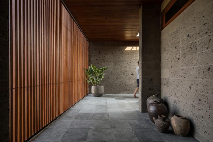 不同的通道、走廊和空间贯穿整座房子。我们使用了再生木材和本地开采的砂岩去打造表面和肌理,以勾起永恒和牢固之感,同时建筑也借鉴了巴厘岛本土的建筑文化。
