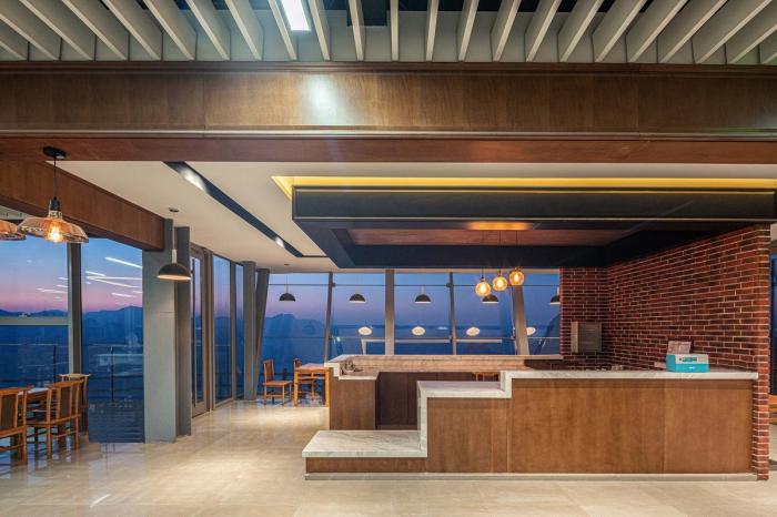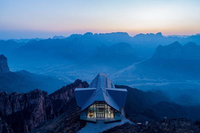 项目平面为长十字形,以适应山崖形状并强调景观朝向。双坡屋面经过切削,中部隆起,在悬崖之上蓄势待发。正脊实为半通透的金属格栅,以隐藏下部平整的天窗,也柔化了建筑轮廓,如同鱼鳍。