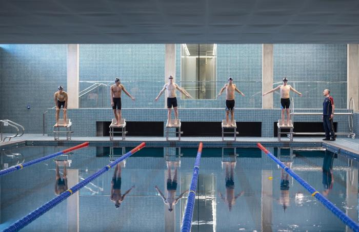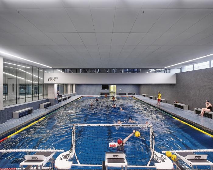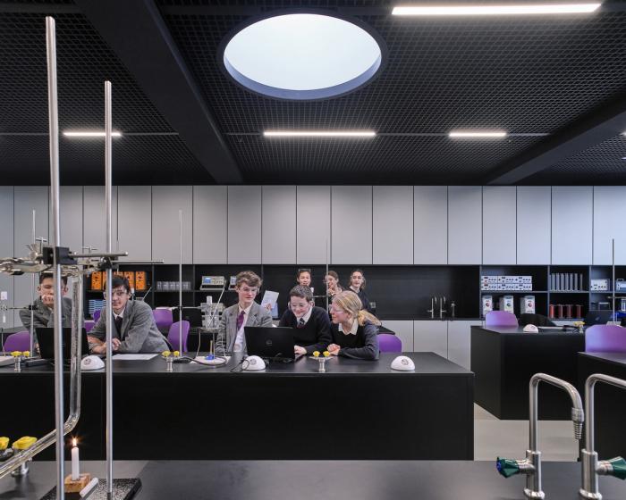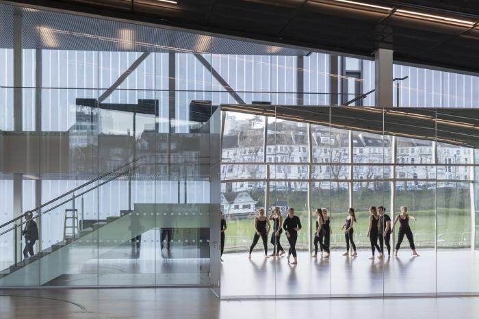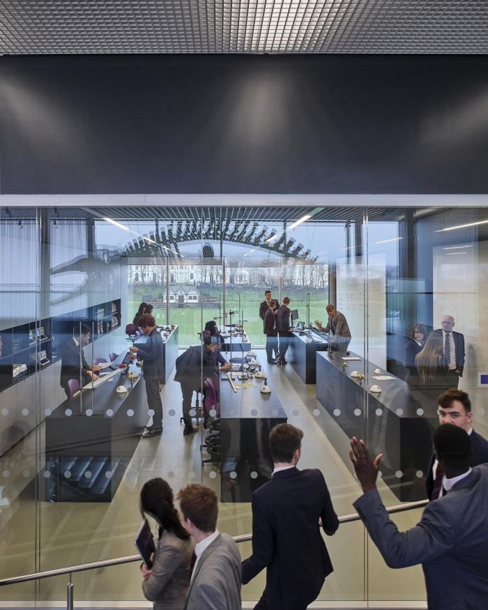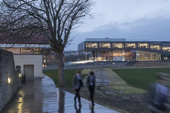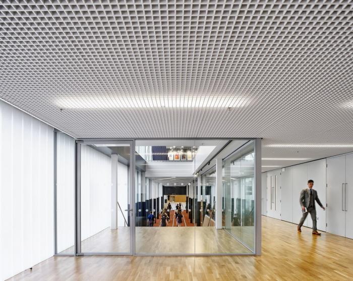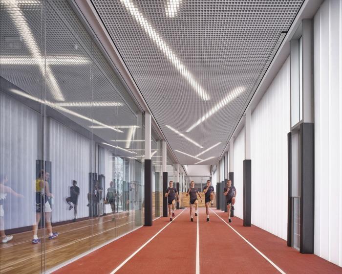 设计的核心概念在于激发学生之间的社会交流:教室外宽敞开放的空间为非正式的互动和私人学习创造了空间。层级的转换,大台阶和玻璃从视觉上连接了两个学院的活动,并促进了不同学科之间预料之外的碰撞。建筑的各个部分彼此敞开:从上方楼层可以直接看到一层的室内跑道,每间教室都拥有通高的落地窗,甚至化学教室里的通风柜都是透明的,使得从走廊经过的人可以直接见证实验现场。