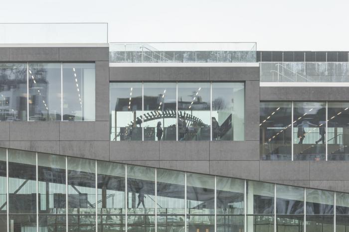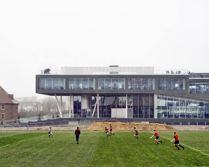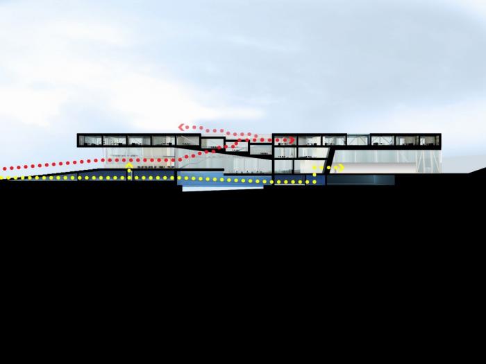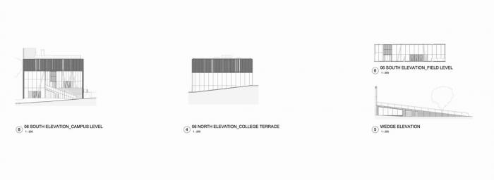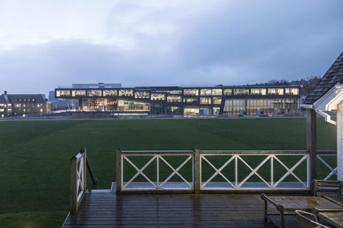 为什么要把科学系和体育系分开?取而代之,该设计将两者融合在一个线性体量内,位于运动场的边缘。主要运动空间与场地位于同一层,体育馆直接面向场地开放。科学学院包括了教室、实验室和一间温,像框架桥一般横跨在体育场馆之上。立面的灵感部分来自新建筑对面梯田房屋的韵律感,建筑的屋顶则提供了北海一览无余的全景视野。