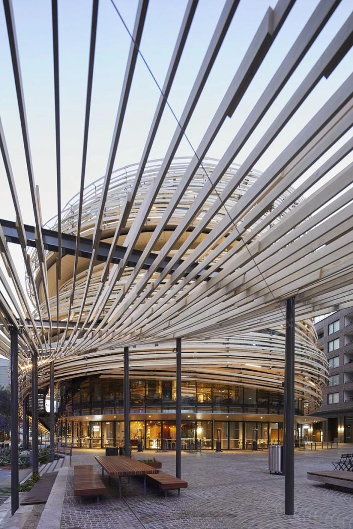 基于有关情况的考虑,设计团队选择了一种无方向性的建筑形式,使得人们可从任何角度都能到达和辨别出来。环形的体量以其用户的多样性反映并提升了达令广场步行商业区的活力。木质的建筑表皮为周边提供了一种自然的肌理,有机而自然的木质表皮包裹着流动的楼层。这种由木条构成的外表皮过滤着自然光线,为内部空间创造了柔和的质感。设计团队以一种有趣而原始的方式,将项目解释为自然的一部分,如“树”或“鸟巢”。