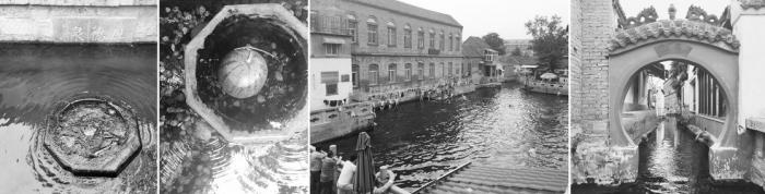 ▲ 由左至右:建筑群西侧尚存的厚德泉;泉水井夏日浸凉瓜果;王府池子露天游泳的盛况;当地民居与穿泉而过的“凤起桥”