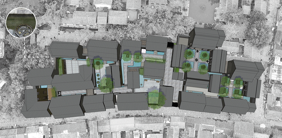 景观的水域,呼应了百花洲片区”家家泉水”居住肌理,水流方向由西侧厚德泉缓缓入院,陆续串联起6个院落,水流方向结合顾客由公区到庭院的行进方向,将古建群落零散的分布,全部由水系串联起来。