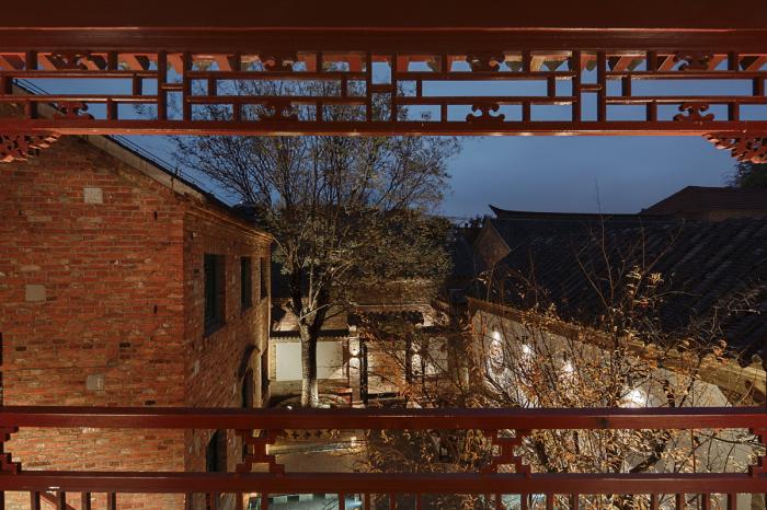 3. 所有建筑均保留原有开窗大小,老样板间采光性不佳,房间内显得阴暗,且部分古建不能大面积拆除和修改窗洞。经过讨论,决定将原修缮后结构梁上的红木色调、经现场反复擦色校对,改为颜色较浅的原木色,从视觉上增加了空间的明亮度和亲人感。同时重新修改了门窗样式,使每个院内的建筑门窗颜色统一,尽量平衡建筑与室内的呼应关系。