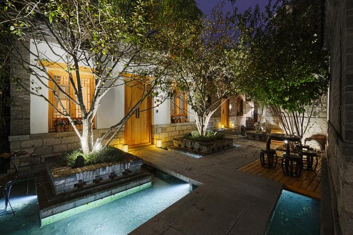 ▲ “百花曼”院落水面照明,“L”形院落曲折通幽,近水的折廊形成开放与私密的边界提示