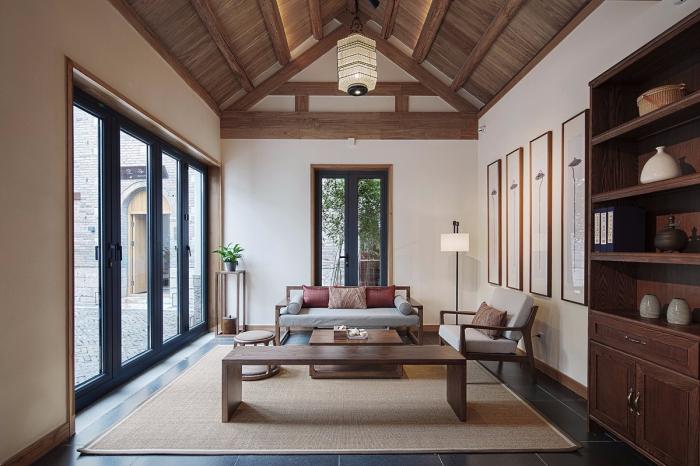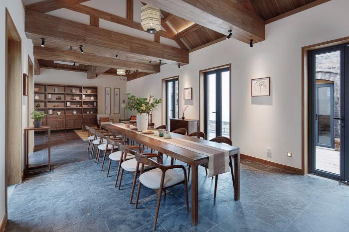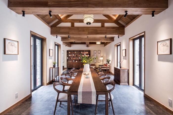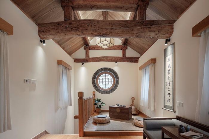 室内设计秉承还原古建序列的原则,在还原建筑木梁结构自身的美感之外,尽可能将原建筑木梁通过擦色、还原、刷木蜡油保护的朴素手法,用原木温润质感增加空间的亲人性。