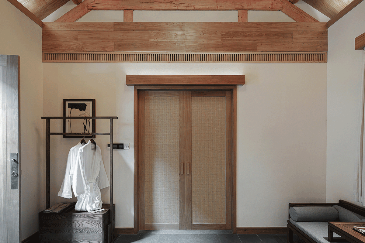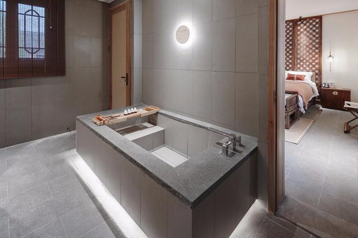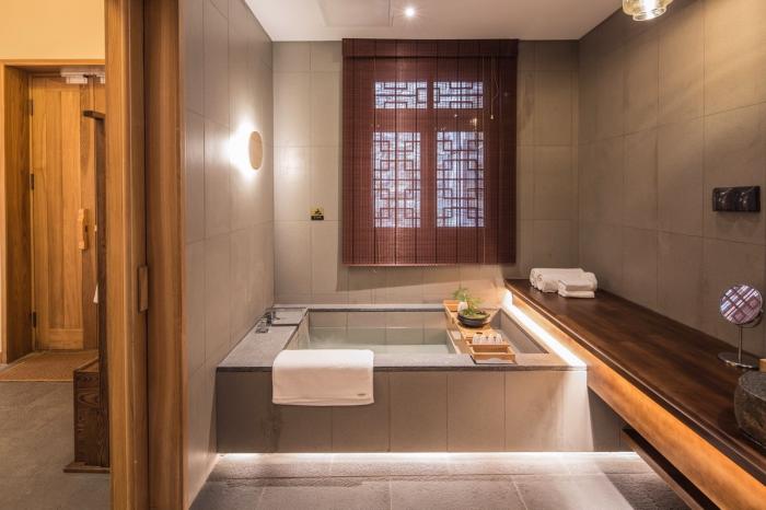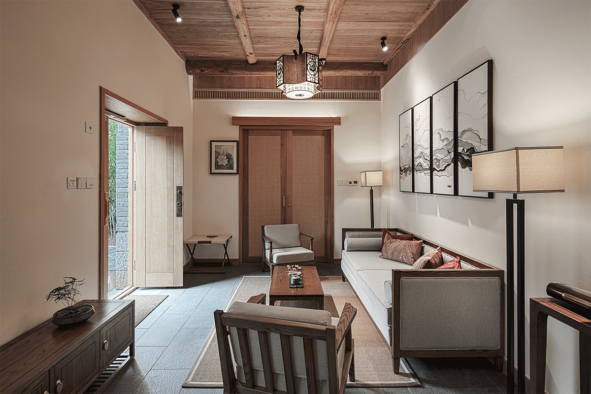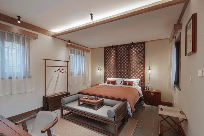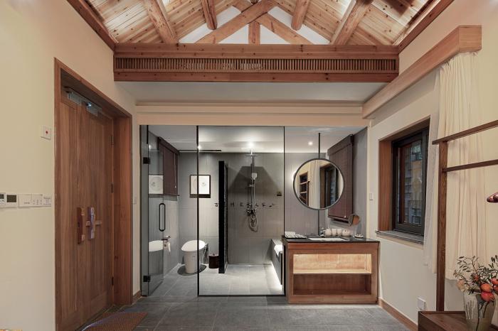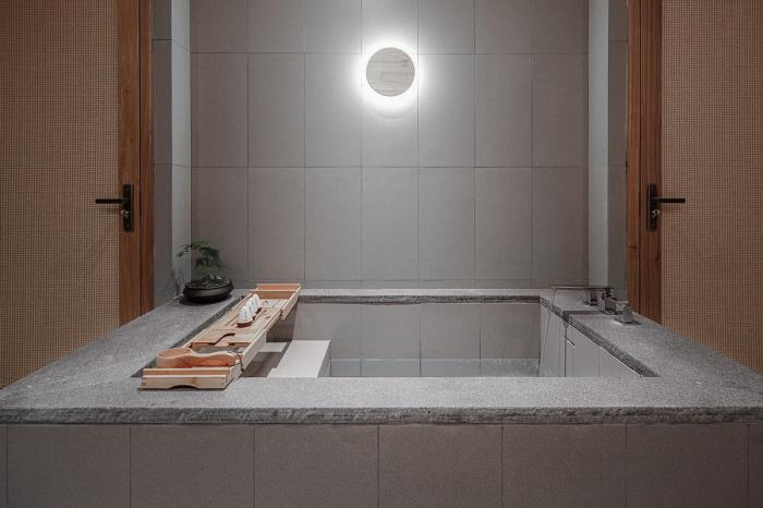 传统古建空间格局有限,所有空间单房间面积均在30㎡上下,设计倡导古建韵味下的现代居住功能,每间作为单独的客房存在,设置“卧室+禅榻+泡池+盥洗功能”,泡池的设置不仅仅是卫浴功能组件之一,更是家家与泉水为邻的人为活动映射。