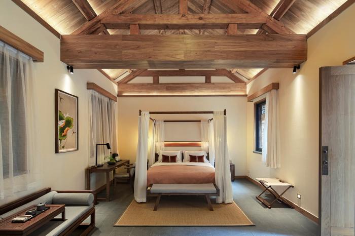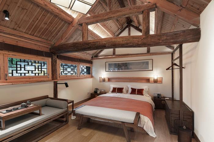 ▲ “醉花院”客房单元/完整的原始结构木梁成为了空间不可替代的记忆点