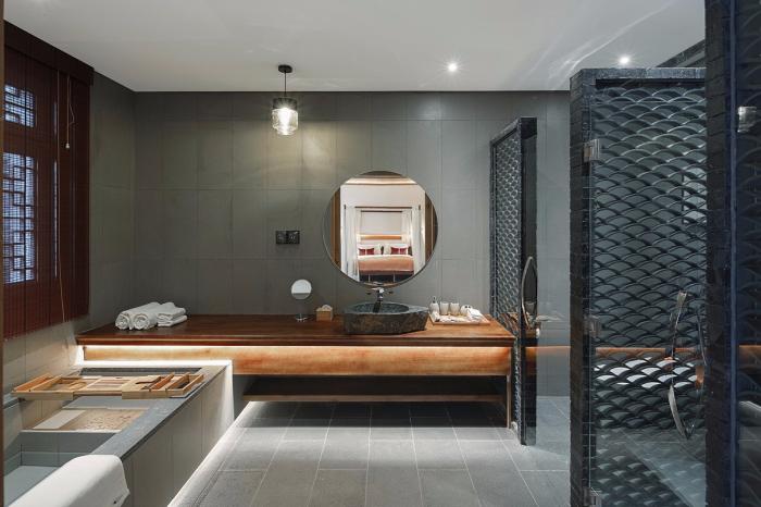 ▲ 盥洗室的砌筑泡池,与通长梳妆台形成错落对比,满足功能和形式的需求