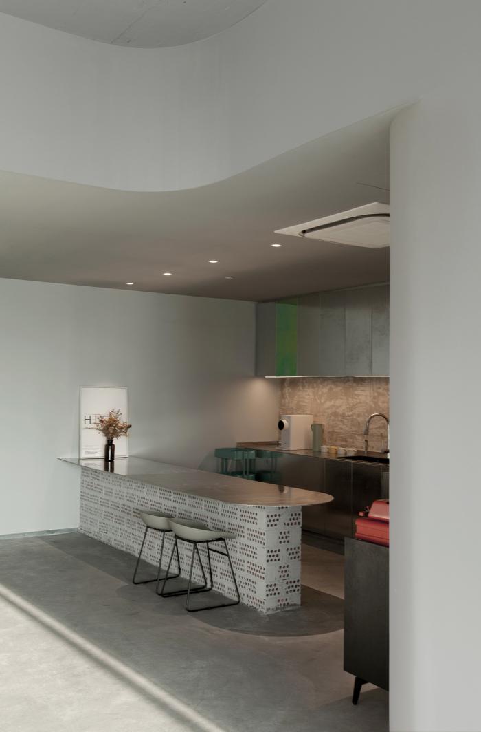 开放式的休闲空间局部吊顶,而沿着巨大的弧形转角则是开阔的办公区域,错落的顶部高差丰富整体空间节奏。