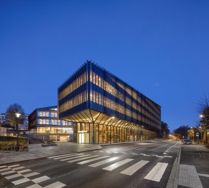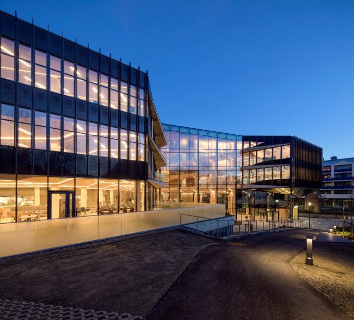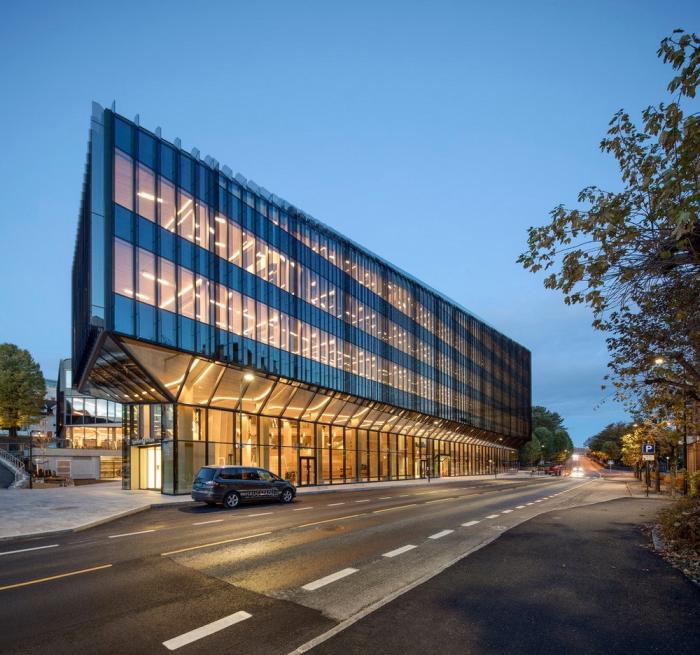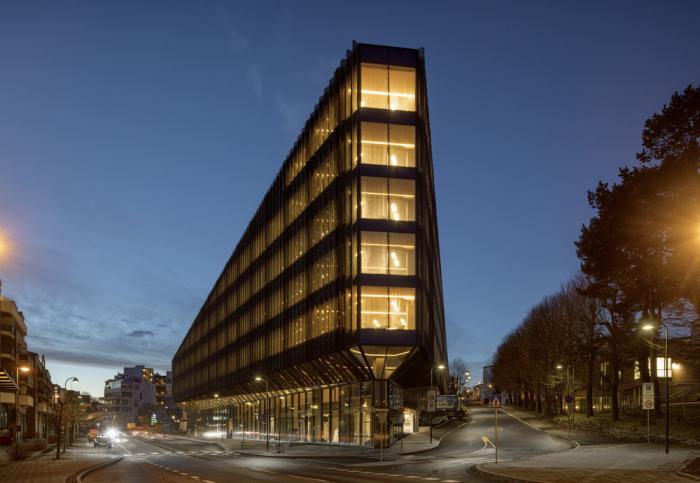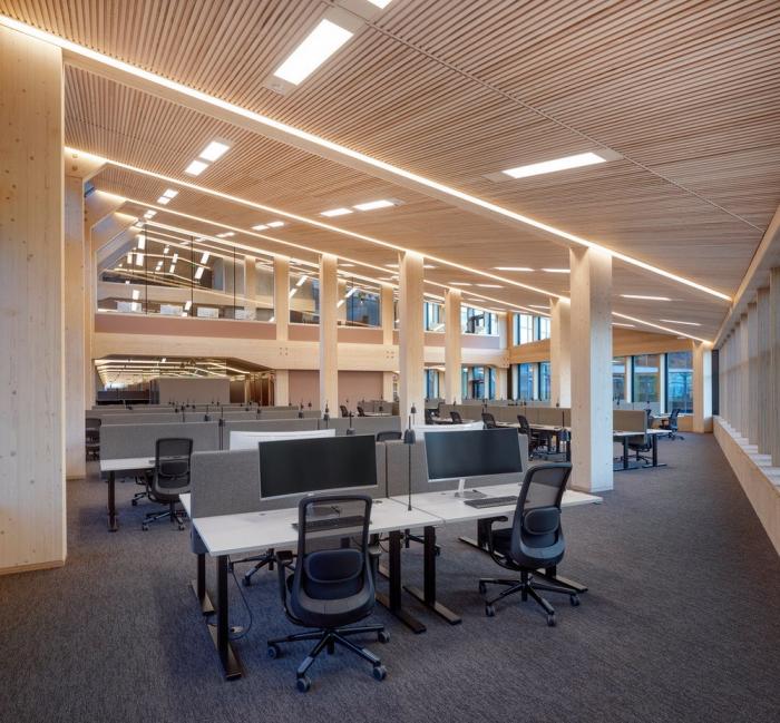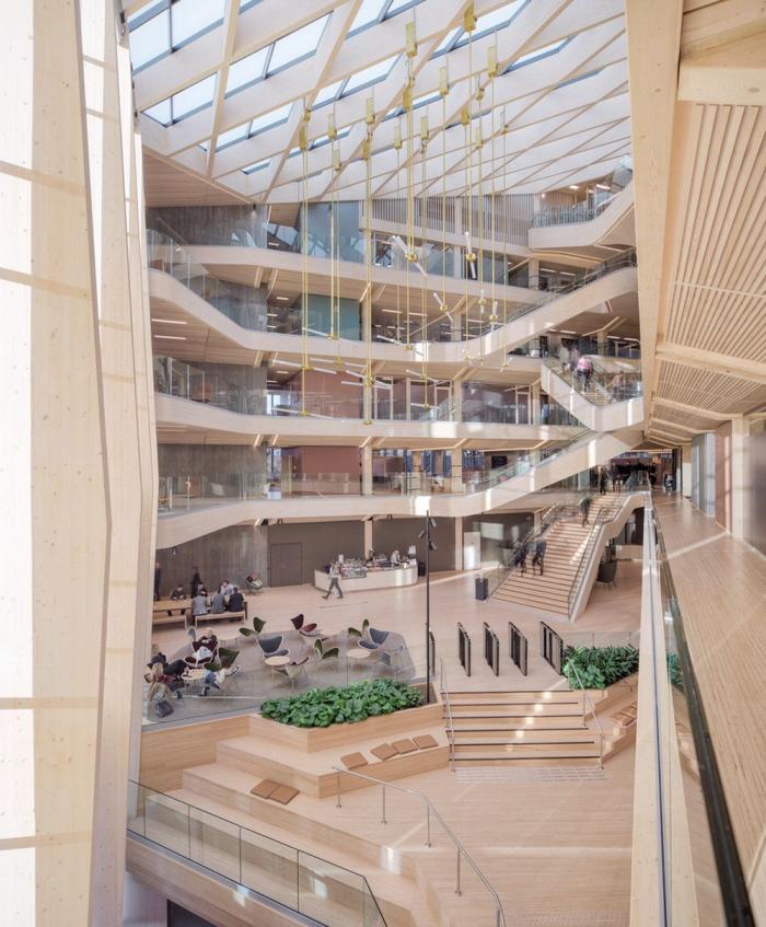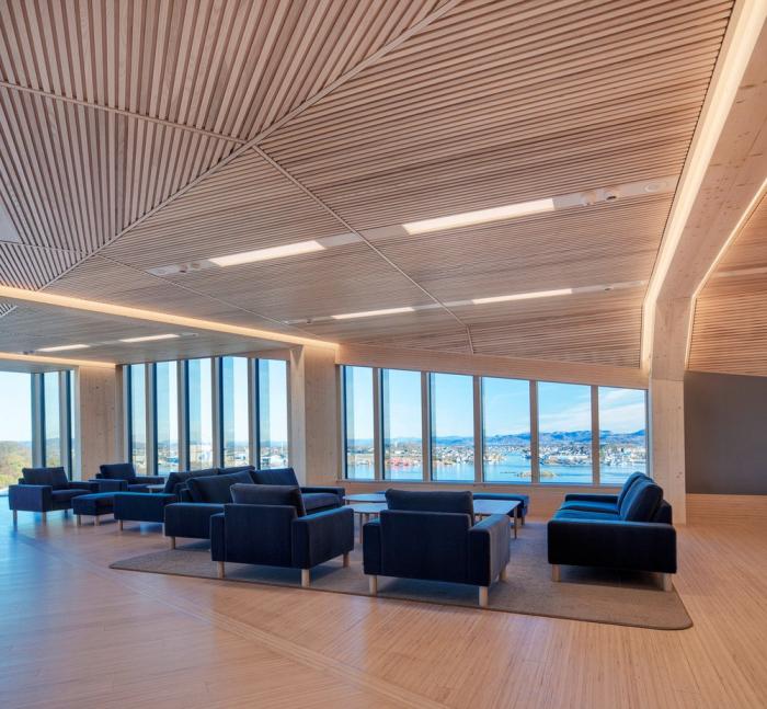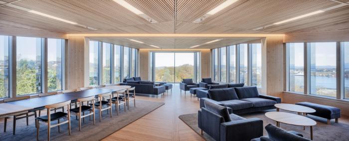 Bjergsted金融园区是位于斯塔万格中心的SR银行新总部。中央金融园区和文化场所的新地址加强了该银行在该地区的独特地位。在这里,公司可以实现其在当地创造价值的愿景,并为周围的环境和建筑物的用户提供最好的服务。该项目为未来办公场所创造了先例,也是欧洲最大的木材办公建筑之一。使用木材建造大规模的银行是对“银行”这一概念的挑战,同时为木结构建筑开辟了新的道路。13200平方米的地面主体结构由高达七层的木材建造而成,它坐落在9000平方米的地下结构之上。
