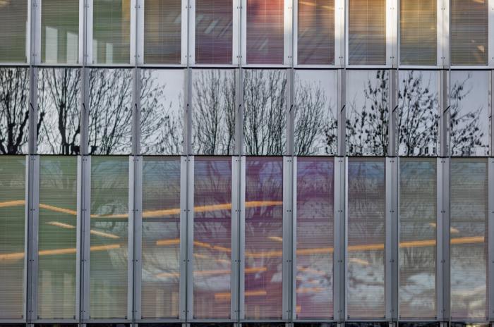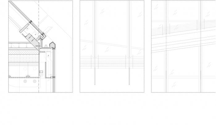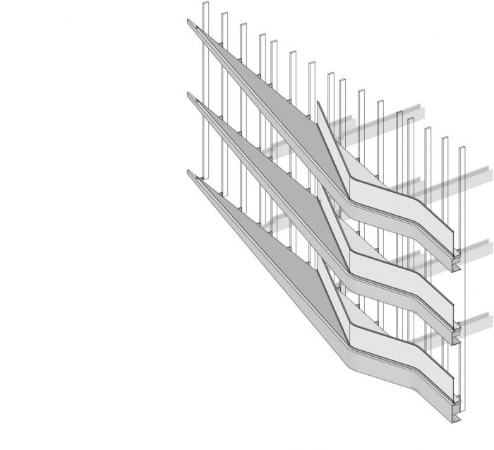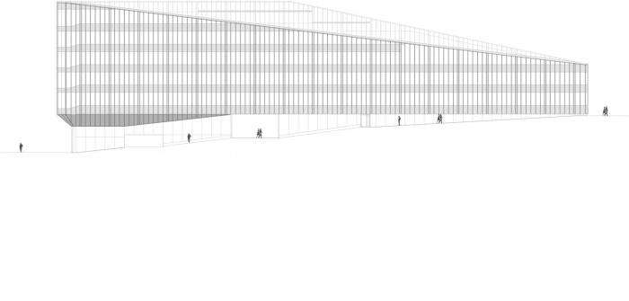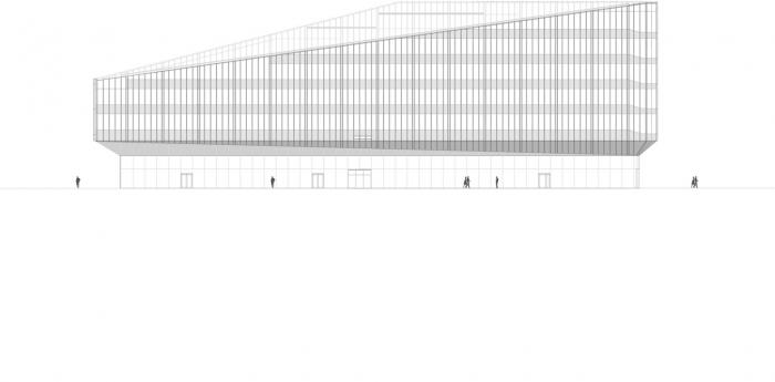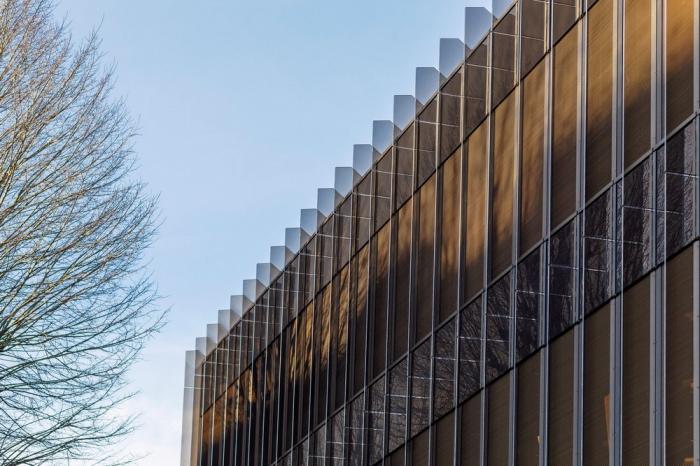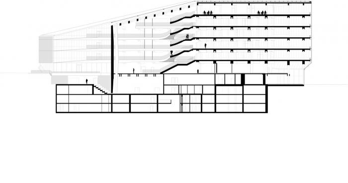 建筑的平面布局围绕中庭展开,将光、空气和绿色植物引入室内。各种非正式的集会场所都面向中庭,作为沿建筑物外立面安静工作场所布置的缓冲地带。建筑体量向外呈尖尖的三角形,通过用于遮阳的垂直玻璃散热片体现了它的锐利。相反,中庭内的木质开放走廊有机地盘旋其中,与三角形的建筑体量形成对比。