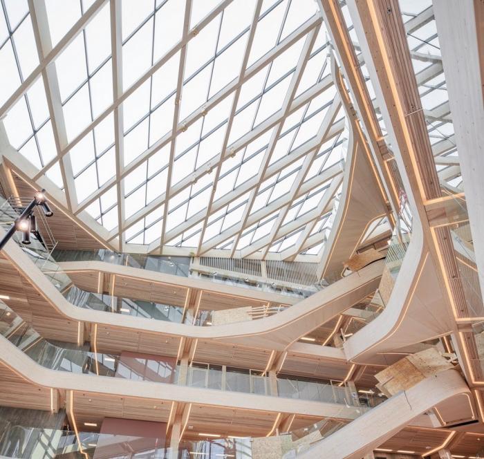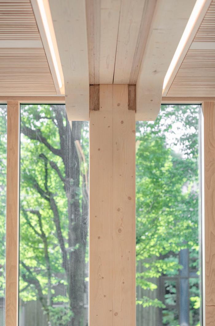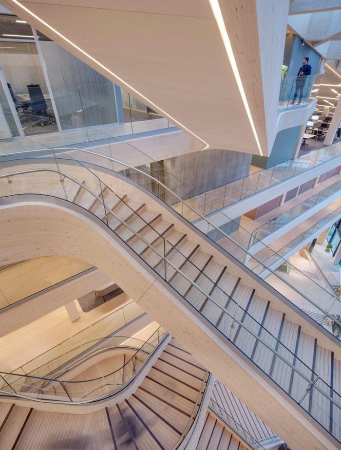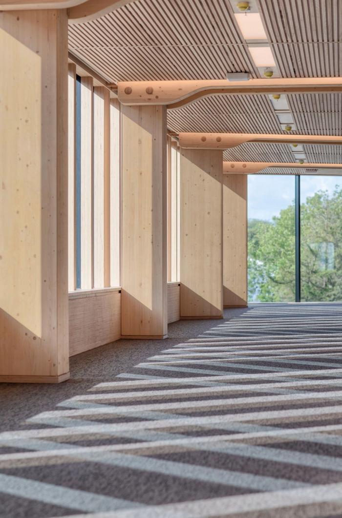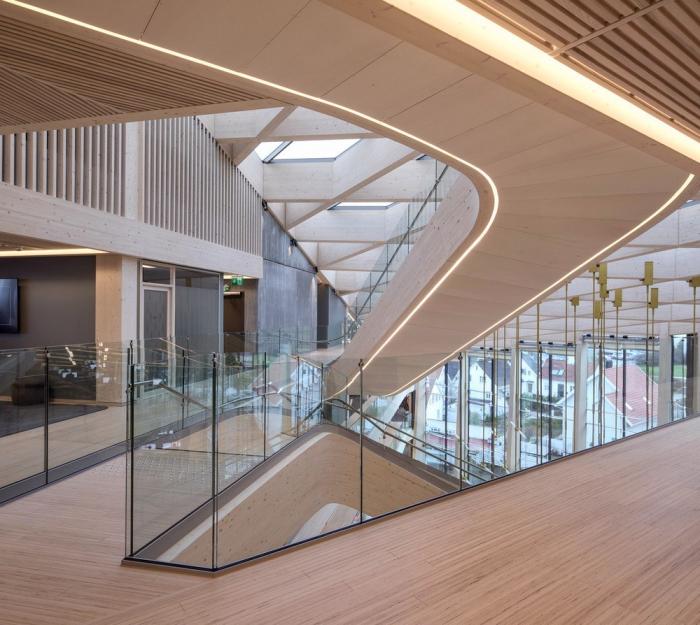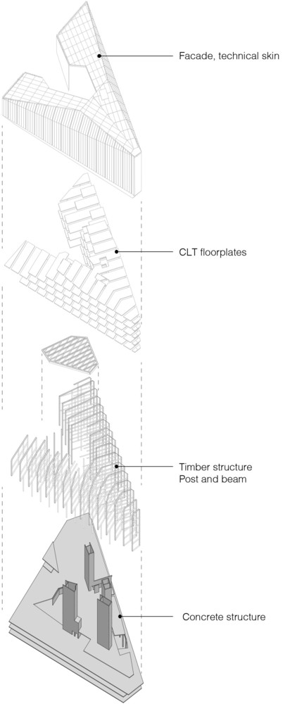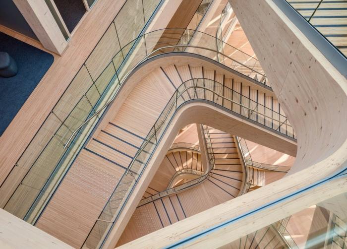 该建筑的特点之一是带有榉木榫钉和有机成型木梁的木材接头。木结构由四个楼梯轴,沿着每一层立面和CLT楼板的层压榉木贴面中的连续边梁来加固。底层立柱和横梁由于悬挑于人行道上方而采用层压山毛榉制成。结构的其余部分是由云杉胶合和交叉层压木材制成的。承重楼梯纵梁在两个方向弯曲,为悬挑至中庭五米处的壮观开放式楼梯提供支撑。结构元素中使用的各种木材都具有相似的美感,它们交织在一起创造了木材整体的有机体验。