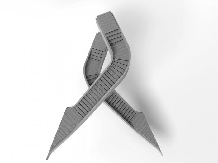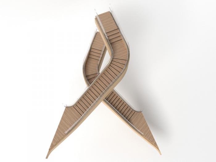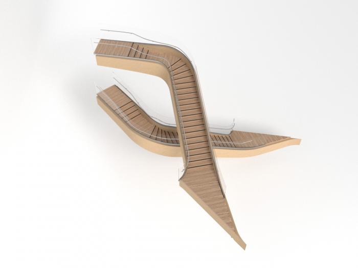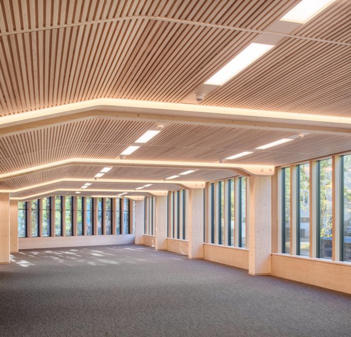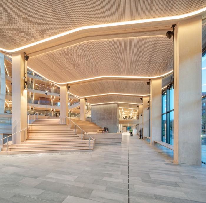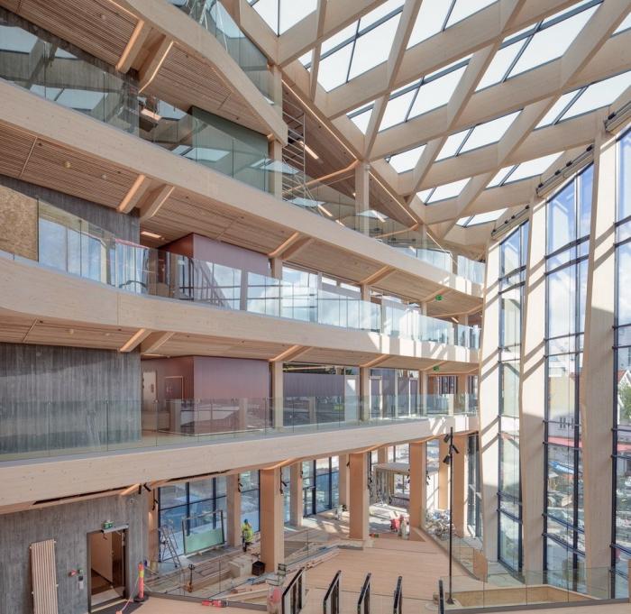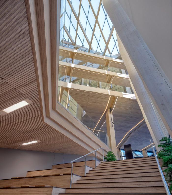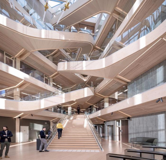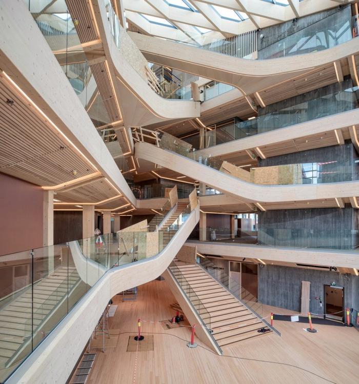该建筑的特点之一是带有榉木榫钉和有机成型木梁的木材接头。木结构由四个楼梯轴,沿着每一层立面和CLT楼板的层压榉木贴面中的连续边梁来加固。底层立柱和横梁由于悬挑于人行道上方而采用层压山毛榉制成。结构的其余部分是由云杉胶合和交叉层压木材制成的。承重楼梯纵梁在两个方向弯曲,为悬挑至中庭五米处的壮观开放式楼梯提供支撑。结构元素中使用的各种木材都具有相似的美感,它们交织在一起创造了木材整体的有机体验。