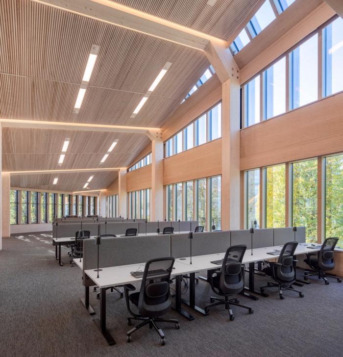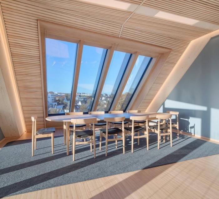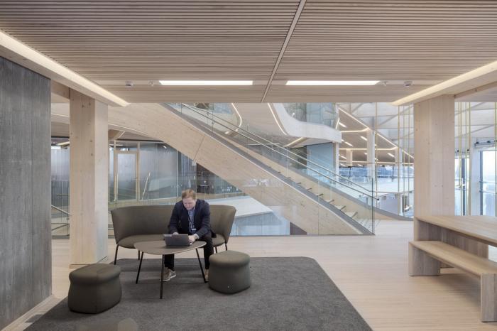木材和可持续性:考虑到木材对未来工作空间体验和品质的积极影响,建筑师从一开始就打算以木材作为主要结构。木材作为一种可持续性材料,为BREEAM-NOR绿色建筑认证奠定了基础。通过增加并细分5×4米的结构网格,可以容纳灵活空间,使得建筑的生命周期得以延长。该项目旨在利用木结构创造真实而独特的空间、构造和审美体验。该项目是与由工程师Hermann Blümer领导的瑞士工程办公室“Creation Holz“共同开发的,该工程师与挪威工程团队“Degree of freedom“合作。