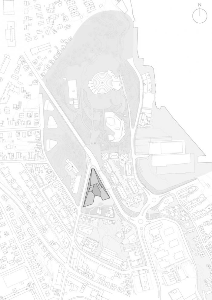 Bjergsted金融园区向城市开放,并在建筑和周围环境之间创造了丰富的联系。建筑师在入口处建立了一个小公园,向传统的小型木结构房屋过渡。东面的建筑物更贴近城市特色,细长而宁静的外立面逐渐延伸至街道。在这里,建筑沿着街道创造了一条有遮蔽的人行道,并设有一个公交车站。这座富有纪念意义的建筑高七层,与Bjergsted公园旧音乐厅形成一条轴线。