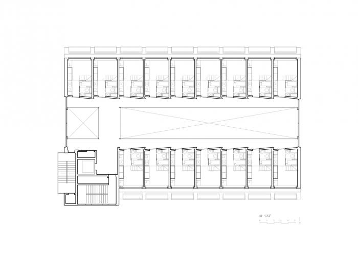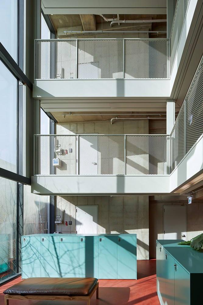细节还有能形成储藏空间的双层移门、便于个性化的正面磁性墙面和模块化的储物柜以及在阁楼单元内增加额外通向中庭的通风窗口来增加室内通风。该项目的美感在于它如何在空间构成上反映了公共的生活方式。中庭既是住房楼的空间中心,同时也是构成空间的私人单元的堆积。