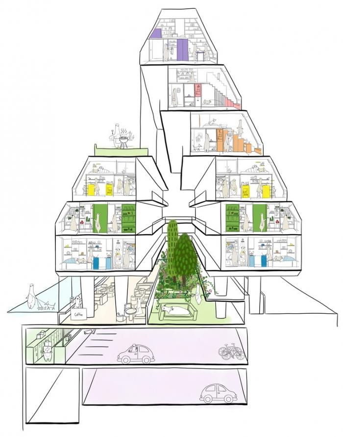 社区没有办法脱离个体存在,个体又通过社区来固定。住户们能够从两个角度看到中间的花园,分别是在底层的入口和进入单元之后。社区并非是一个强制的概念,它是在潜移默化中形成。每一个带有独立卫浴和厨房的单元都是为一个个体设计的,住户们只有在使用更大型适合公共体验的设施才共享空间。