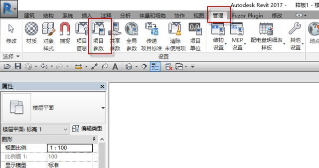 1、新建一个项目样板,点击“管理”面板,选择项目参数,添加项目参数。